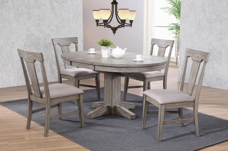Gray finish with black burnished edged finish round dining with butterfly self-storing leaf. Matching chairs in a soft Gray Linen