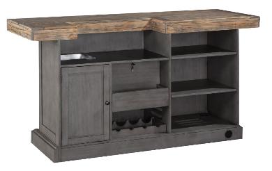 Features double bottle locking bottle well, stainless steel dry sink.